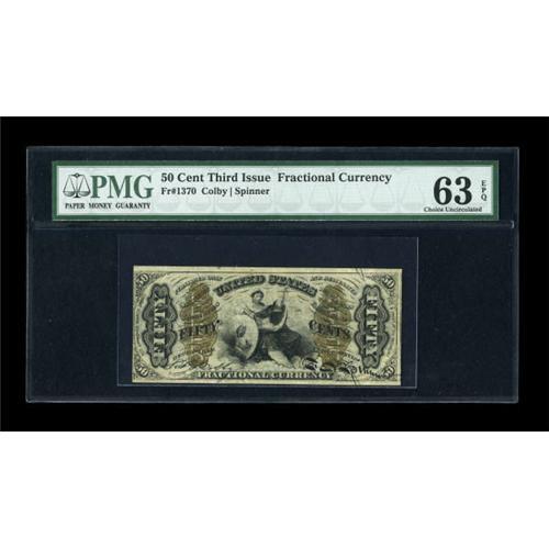 <B>Fr. 1370 50c Third Issue Justice PMG Choice Uncirculated 63 EPQ.</B></I> A pencil notation may have once again been a grade limiting factor as this note is screamingly original with a tight margin visible at left on the face.<BR><BR><b>Shipping:</b> Coins & Currency (<a target="_blank" href="http://www.heritageauctions.com/common/shipping.php">view shipping information</a>)
