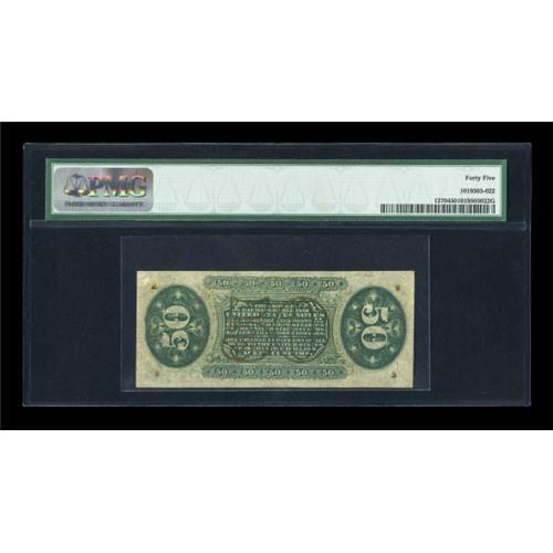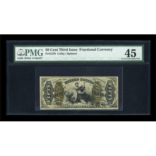 <B>Fr. 1370 50c Third Issue Justice PMG Choice Extremely Fine 45.</B></I> This Fiber Paper Green Back Justice has outstanding margins, good print quality and the eye appeal of a Choice New example. A very hard number to find with this splendid appearance.<BR><BR><b>Shipping:</b> Coins & Currency (<a target="_blank" href="http://www.heritageauctions.com/common/shipping.php">view shipping information</a>)