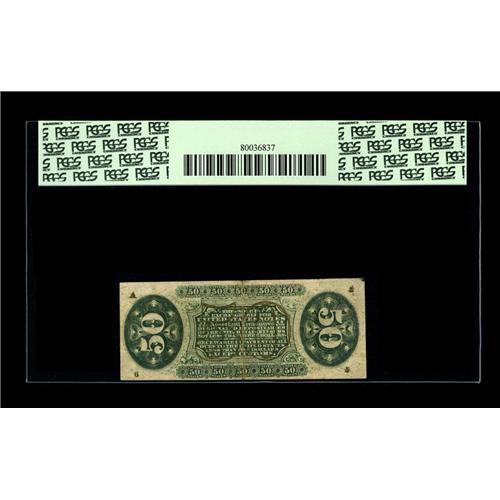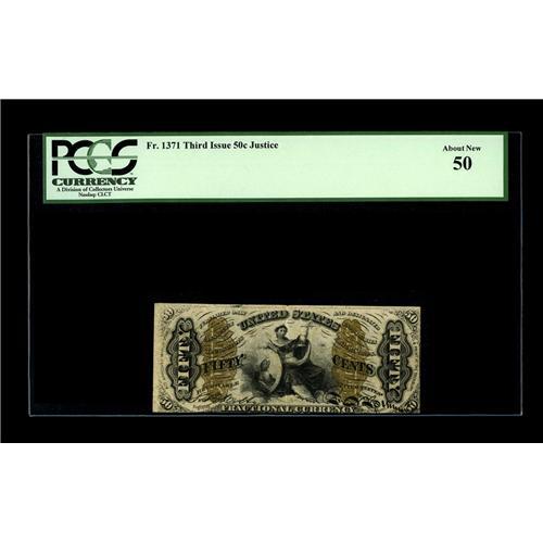 <B>Fr. 1371 50¢ Third Issue Justice PCGS About New 50.</B></I> A very rare Justice note, with fewer than 20 examples known in all grades combined. "1" and "a" Fiber Paper Justices are classically rare, and on many of the handful of known notes, either the "1" or the "a" is weakly printed. On this example, both are razor sharp and can be seen at a glance. This one also has better-than-normal centering with large margins at the top and the left--the right and bottom margins just touch the design. The note also has bright bronze and much of the look of a Choice New example. It's held from that grade by a single vertical center fold.<BR><I>From The Bill and Kathy Stella Currency Collection</B></I><BR><BR><b>Shipping:</b> Coin/Currency (<a target="_blank" href="http://www.heritageauctions.com/common/shipping.php">view shipping information</a>)