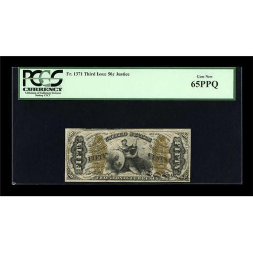 <B>Fr. 1371 50c Third Issue Justice PCGS Gem New 65PPQ.</B></I> To date, this lovely Gem is the only uncirculated Fr. 1371 graded by either major service. We've handled almost all the significant Fractional collections to reach the market in the past 20 years and have seen only a single superior Fr. 1371. This note could remain the highest graded by either service for years to come if not forever. It has extraordinary color for a Fiber Paper Justice, with reflective bright bronze, bright paper and ideal inks. One of the finest Fractional notes in Tom Flynn's collection, and a note that could easily reach or exceed...<BR><I>From The Thomas M. Flynn Collection</B></I><BR><BR><b>Shipping:</b> Coins & Currency (<a target="_blank" href="http://www.heritageauctions.com/common/shipping.php">view shipping information</a>)