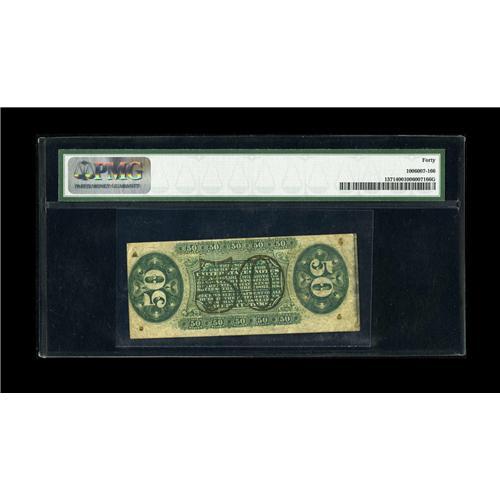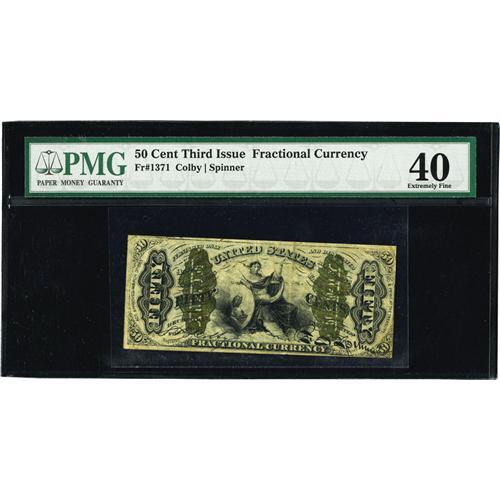 <B>Fr. 1371 50c Third Issue Justice PMG Extremely Fine 40.</B></I> Fr. 1371 is one of the ten most difficult Fractional notes to acquire and this one is a nice example. The margins are irregular, except for the right face, they are primarily large. It is weakly printed at the left edge, as is often the case for this rare number. An overall pleasing "1" and "a" Fiber Paper Justice note that would be very hard to improve upon in this price range.