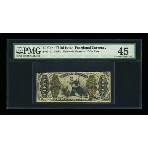 <B>Fr. 1372 50c Third Issue Justice PMG Choice Extremely Fine 45.</B></I> This piece appears fully About New, though close examination reveals a few folds. Overall, the eye appeal is exceptional even with the top margin being cut slightly into the design.<BR><BR><b>Shipping:</b> Coins & Currency (<a target="_blank" href="http://www.heritageauctions.com/common/shipping.php">view shipping information</a>)