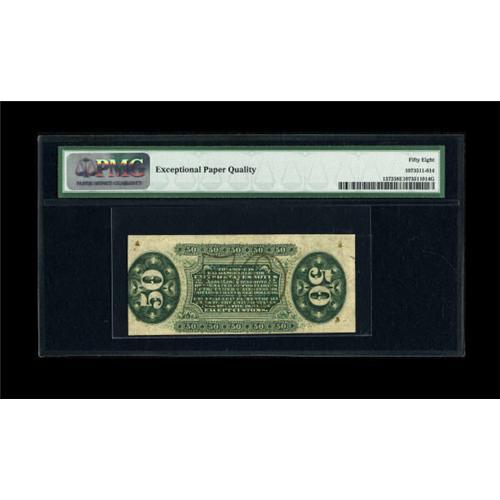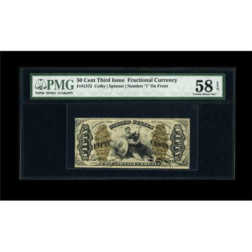<B>Fr. 1372 50c Third Issue Justice PMG Choice About Unc 58 EPQ.</B></I> A really scarce fiber-paper Justice number. Two of the margins are tight as is usually the norm, but the note has an excellent overall appearance.<BR><BR><b>Shipping:</b> Coins & Currency (<a target="_blank" href="http://www.heritageauctions.com/common/shipping.php">view shipping information</a>)