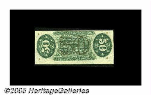<B>Fr. 1372 Milton 3R50.12b 50¢ Third Issue Justice Very Choice New.</B></I> Most unusually bright for a Fiber Paper Justice, with all its original embossing, flashy bronze and tremendous eye appeal. If the right face margin, which is cut just along the frame line, were the size of the other three margins, this note would be a Superb Gem. Even with this centering, this one is exceptional.