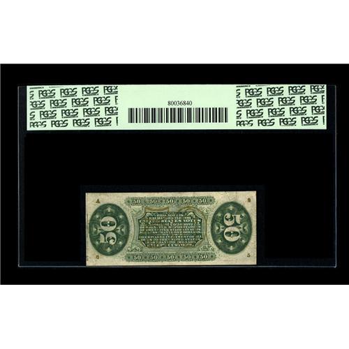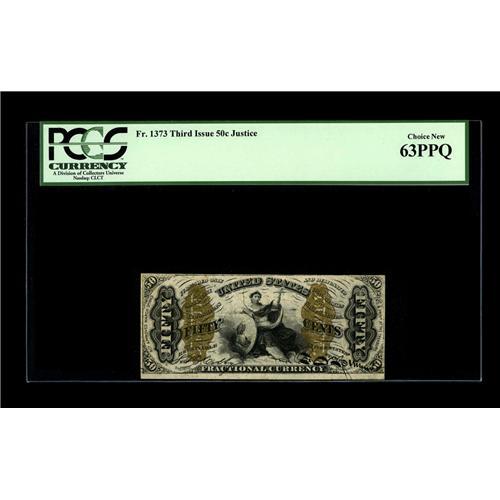 <B>Fr. 1373 50¢ Third Issue Justice PCGS Choice New 63PPQ.</B></I> A lovely fiber paper note with a huge bottom margin, two close margins, and a nice margin at the left face. The back is perfectly centered. Overall, the eye appeal and paper surfaces are excellent as this note would approach the Gem grade but for the right margin. Kravitz lists this variety at $1,000 in Choice CU and the only example from the O'Mara collection was a superb gem that realized $2,185 with the buyer's premium. Not a lot of Fr. 1373s will ever be graded at this level and above.<BR><I>From The Bill and Kathy Stella Currency Collection</B></I><BR><BR><b>Shipping:</b> Coin/Currency (<a target="_blank" href="http://www.heritageauctions.com/common/shipping.php">view shipping information</a>)