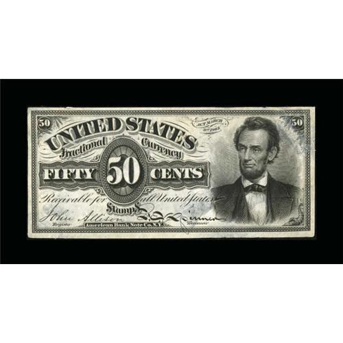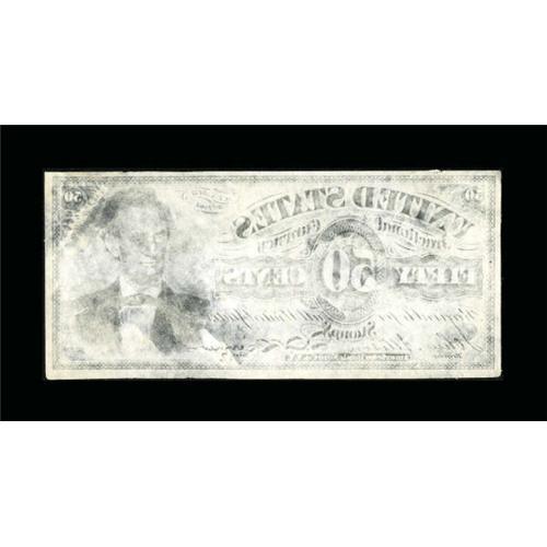 <B>Milton 4S50F.1a 50¢ Fourth Issue Proof Choice About New.</B></I> This piece was previously part of the Thomas O'Mara Collection and is an incredible item that we have certainly never seen before and one of a very few special printings of the 50¢ Lincoln notes of any form on any paper. Interestingly, the Milt Friedberg Collection did not contain any form of Lincoln Specimen or Proofs. There are some minor surface wrinkles and the note faces up well for having been previously mounted. One corner has also been reinforced with archival tape.<BR><BR><b>Shipping:</b> Coins & Currency (<a target="_blank" href="http://www.heritageauctions.com/common/shipping.php">view shipping information</a>)