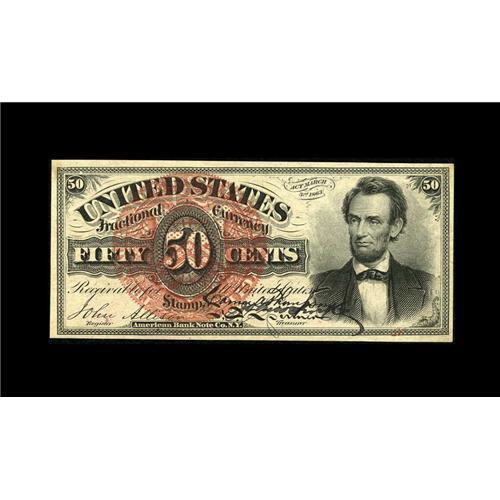 <B>Fr. 1374 50¢ Fourth Issue Lincoln Double Courtesy Autograph Choice New.</B></I> This beautifully margined Lincoln bears the double courtesy autograph of Carmi Thompson and John Burke. Both have signed directly above Spinner's signature. Double courtesy autographs on Fractionals are rather scarce, and very few exist on a 50¢ Lincoln. Adding to the value is that the host note is fully Choice Uncirculated and a $500+ item in its own right.<BR><BR><b>Shipping:</b> Coin/Currency (<a target="_blank" href="http://www.heritageauctions.com/common/shipping.php">view shipping information</a>)