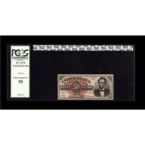 <B>Fr. 1374 50c Fourth Issue Lincoln PCGS Choice About New 55.</B></I> This broadly margined note has a light center fold that accounts for the grade.
