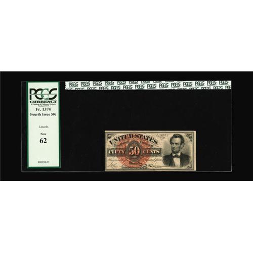 <B>Fr. 1374 50c Fourth Issue Lincoln PCGS New 62.</B></I> This Lincoln's left edge runs along the frame line, while the right margin is huge, and the top and bottom margins are plenty wide for the issue.