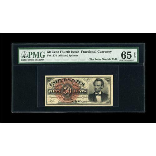 <B>Fr. 1374 50c Fourth Issue Lincoln PMG Gem Uncirculated 65 EPQ.</B></I> The back centering is better than average and the color bold on this Lincoln, which has received the coveted grade of Gem Uncirculated 65 EPQ by PMG.<BR><I>From The Peter Gamble Collection.</B></I><BR><BR><b>Shipping:</b> Coins & Currency (<a target="_blank" href="http://www.heritageauctions.com/common/shipping.php">view shipping information</a>)