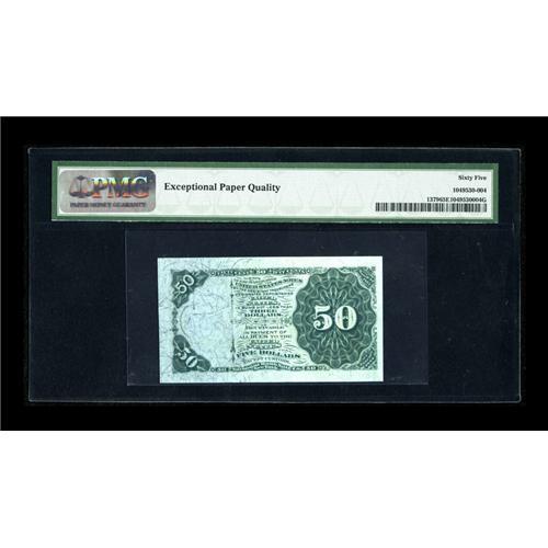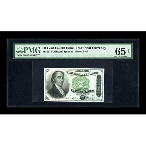 <B>Fr. 1379 50c Fourth Issue Dexter PMG Gem Uncirculated 65 EPQ.</B></I> Gem condition Dexters are a statistical anomaly since they infrequently are found with both the margin size and centering required for the grade. This example has both bountiful margins and exceptional centering as well as vibrant ink colors.<BR><BR><b>Shipping:</b> Coins & Currency (<a target="_blank" href="http://www.heritageauctions.com/common/shipping.php">view shipping information</a>)