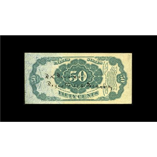 <B>Fr. 1381 50¢ Fifth Issue Courtesy Autograph Choice New.</B></I> This Fifth Issue 50¢ note serves as the host for the very rare courtesy autograph, "B.K. Bruce - Register U.S. Treasury." The Courtesy Autograph appears at the center of the back.
