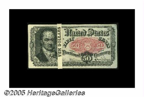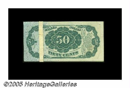 <B>Fr. 1381 50¢ Fifth Issue Very Choice New.</B></I> A lovely original Crawford bundle that squares up beautifully. All but one of the notes are from either the "E" or "M" plate positions, which is indicative of an original bundle. More than half of the notes are pure Gems, with large margins and great centering; the rest grade Choice due solely to their centering. A fresh and original bundle, held together by the unbroken treasury band that reads, "TEN DOLLARS."