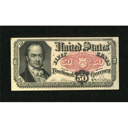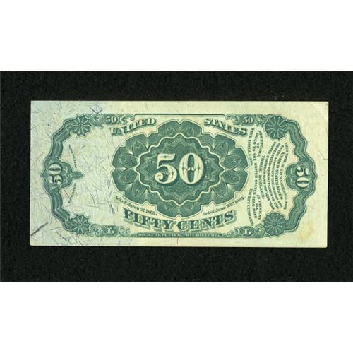 <B>Fr. 1381 50c Fifth Issue Choice About New.</B></I> A lovely Crawford note that is original and well embossed with an upper corner fold and a small pinhole.<BR><BR><b>Shipping:</b> Coins & Currency (<a target="_blank" href="http://www.heritageauctions.com/common/shipping.php">view shipping information</a>)