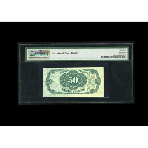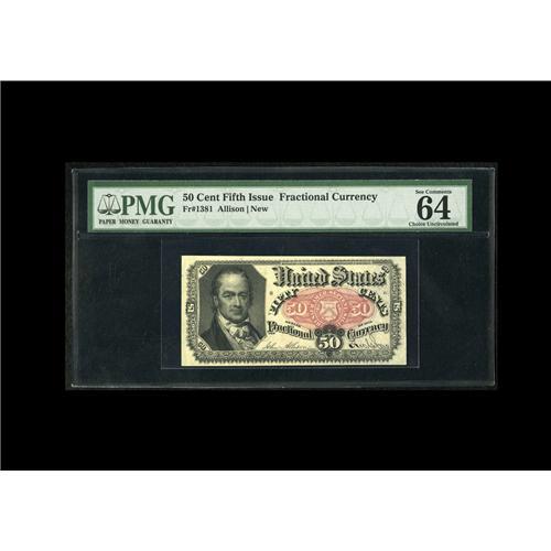 <B>Fr. 1381 50c Fifth Issue PMG Choice Uncirculated 64 EPQ.</B></I> A spectacular Crawford note which appears to be a screaming gem from the face but with the back design shifted just a little too high for that lofty designation. Bold print quality is accompanied by vibrant hues and sharp corners. These have been realizing in the neighborhood of $200 in this grade and we see no reason to buck that trend.
