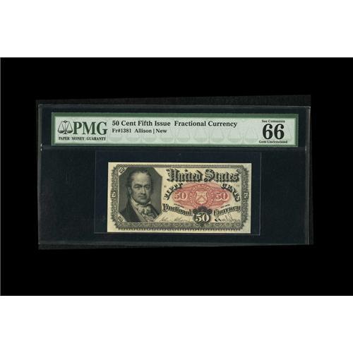 <B>Fr. 1381 50c Fifth Issue PMG Gem Uncirculated 66 EPQ.</B></I> A brightly colored piece with nearly perfect margins and centering.