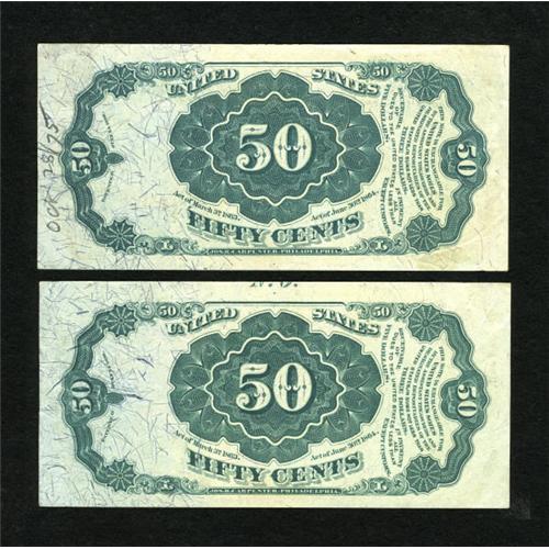 <B>Fr. 1381 50c Fifth Issue Two Examples About New.</B></I> The notes show edge handling on their original paper surfaces while one has pencilled on the back, "Oct 28/75." <BR><BR><b>Shipping:</b> Coins & Currency (<a target="_blank" href="http://www.heritageauctions.com/common/shipping.php">view shipping information</a>)