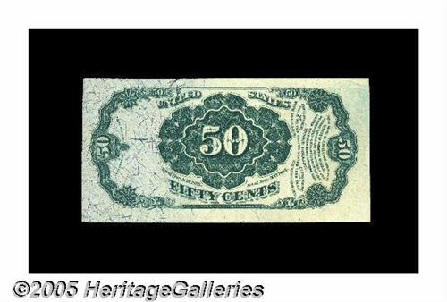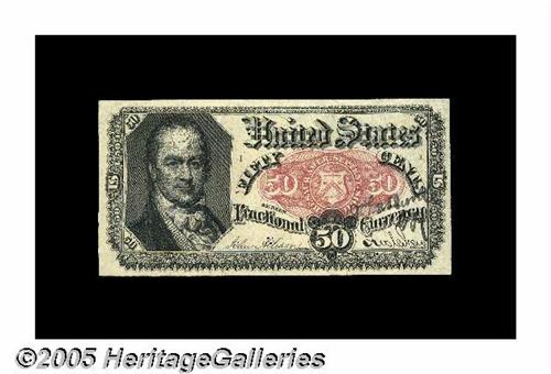 <B>Fr. 1381 Milton 5R50.1g 50¢ Fifth Issue Courtesy Autograph Gem New.</B></I> John Burke's bold signature appears above that of the engraved John New. The host note is a perfect Gem.