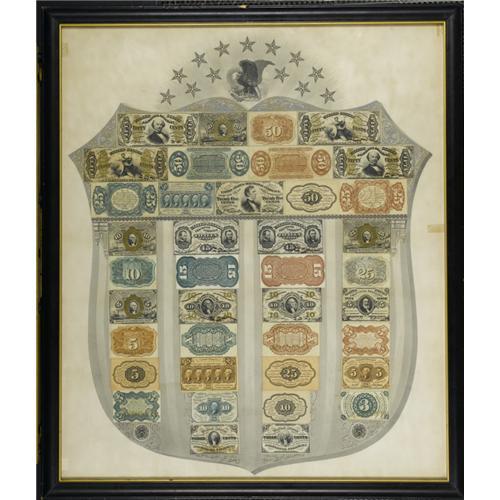 <B>Fr. 1382 Fractional Currency Shield, With Gray Background.</B></I> A far nicer than average Gray Shield, fully wide out beyond the points at the top sides and bottom. The gray background is boldly printed and all the notes are bright save for the always faded 25¢ Second Issue back. The Shield is housed in a medium brown hardwood frame with a gold inner border. There are two tiny taped edge splits far outside the shield itself which would disappear with a restorers touch. On balance, this is one of the half dozen nicest Gray Shields that we have had the pleasure of handling, and we have handled a lot of Gray Shields.<BR><I>From The Troy Wiseman Collection</B></I>