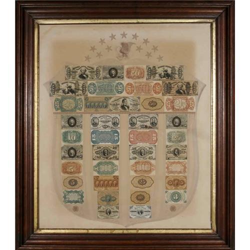 <B>Fr. 1383 Fractional Currency Shield, With Pink Background.</B></I> A nice example of the very rare Pink Background Fractional Currency Shield. It's contained in a broad hardwood frame with a gold-leaf inner band and backed with thin wood planks. It is free from problems or water stains, and the pink color has toned attractively toward lavender. The Red and Green Backs of the notes are fully bright. A few of the faces have aged lightly, and the Second Issue 25¢ Back has faded as always on Shields. While not quite as rare as Green Shields (approximately 10 known), this Pink variety (approximately 20 known) is many times rarer than the normal Gray Background Shield which certainly exists in a quantity approaching 500. Auction appearances of Pink Shields are infrequent enough that these are difficult to estimate, but we think we are right in the range with...