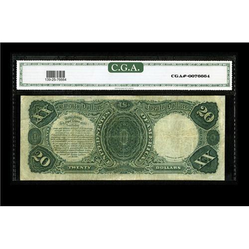 <B>Fr. 139 $20 1880 Legal Tender CGA Very Fine 25.</B></I> It has been over seven years since an example of this Friedberg number has appeared with us at auction. Wide margins and pleasing inks grace this note which is new to the census by way of the Great Lakes Collection. This certainly would qualify as a sleeper number based on the number of times the Fr. 139 has appeared at auction. Only 17 examples currently are known and with the demand for scarce Large Size Type far outstripping supply expect a realization in the area of..
