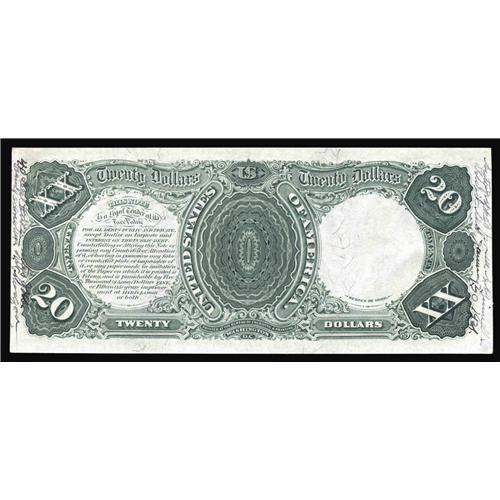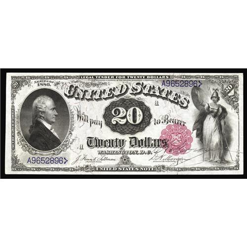 <B>Fr. 141 $20 1880 Legal Tender Courtesy Autograph Superb Gem New.</B></I> One of a short run of notes that bears the courtesy autograph of Daniel N. Morgan above his engraved signature as Treasurer. This note has the added interest of having been personally presented by Morgan to pioneering paper-money collector Albert Grinnell. In the side margin of the back, Morgan has written a personalized memo, "Autographed for Albert Grinnell, Detroit Mich. January 30, 1921." The opposing margin has a partially legible inscription, "40 Legal Tender Notes ... D.N. Morgan." A spectacular note simply for its grade, with the inscription and courtesy autograph adding both historical interest and value.