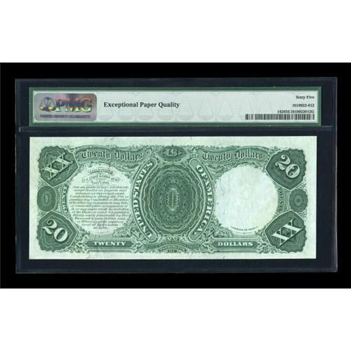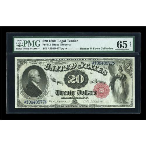 <B>Fr. 142 $20 1880 Legal Tender PMG Gem Uncirculated 65 EPQ.</B></I> A lovely Gem example of a Friedberg number for which Track & Price records 106 known pieces in all grades combined. This one certainly seems deserving of both its 65 grade and the Exceptional Paper Quality comment that it received. A handsome type note.<BR><I>From The Thomas M. Flynn Collection</B></I><BR><BR><b>Shipping:</b> Coins & Currency (<a target="_blank" href="http://www.heritageauctions.com/common/shipping.php">view shipping information</a>)