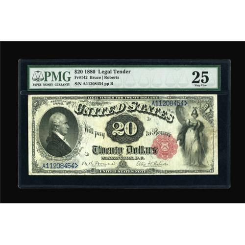 <B>Fr. 142 $20 1880 Legal Tender PMG Very Fine 25.</B></I> The blue serial numbers and red seal are all still quite bold for the grade. The margins are full and the overall eye appeal closer to EF.<B><BR></B></I><I>From The Warren Marshall Collection</B></I><BR><BR><b>Shipping:</b> Coins & Currency (<a target="_blank" href="http://www.heritageauctions.com/common/shipping.php">view shipping information</a>)