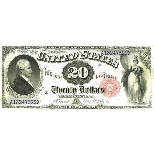 <B>Fr. 143 $20 1880 Legal Tender Very Fine.</B></I> This is a scarcer signature combination within the overall design type, with only about 60 notes documented in all grades combined. Tonight's example is solidly within the parameters of its grade and is an ideal acquisition for a collector seeking a nice looking note available for less than a bank account draining figure.