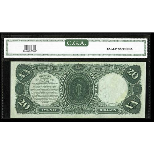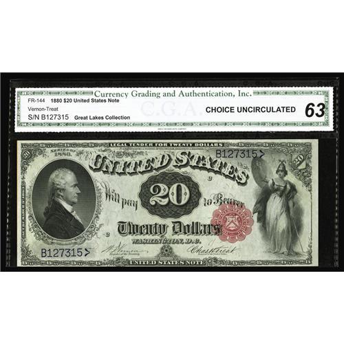 <B>Fr. 144 $20 1880 Legal Tender CGA Choice Uncirculated 63.</B></I> Fr. 144 is the scarcest note of the 1880 $20 red seal blue number type group which included the six numbers from Fr. 140 to 145. There are currently less than 40 examples listed from Fr. 144. This example is beautifully bright and loaded with eye appeal. Last appearance was in Lyn Knight's August 2005 sale of the Great Lakes Collection.