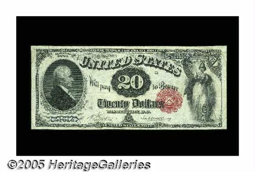 <B>Fr. 145 $20 1880 Legal Tender Fine-Very Fine.</B></I> Quite a scarce number, with only a few more than 50 examples known. This one has a fair degree of circulation, but it's held on to all its ink color, and the paper remains bright. It's an ideal example to represent the type in a circulated collection, with the added bonus of its being quite a scarce number. This is just the kind of note that the collecting public has been piling on for at auction. Don't look for a bargain here or you'll go home without it.