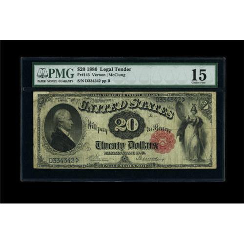 <B>Fr. 145 $20 1880 Legal Tender PMG Choice Fine 15.</B></I> Less than sixty examples are known for this tougher Friedberg number.<BR><BR><b>Shipping:</b> Coins & Currency (<a target="_blank" href="http://www.heritageauctions.com/common/shipping.php">view shipping information</a>)