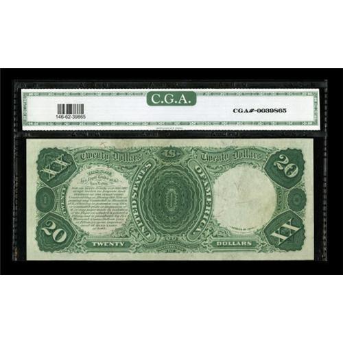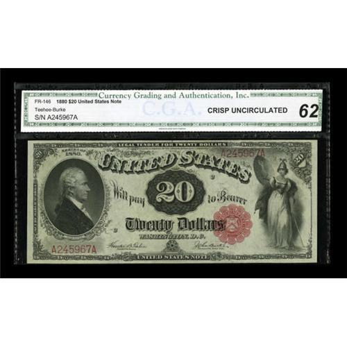 <B>Fr. 146 $20 1880 Legal Tender CGA Crisp Uncirculated 62.</B></I> Gem worthy margins are noted on this fully uncirculated issue. A lone corner tip fold that is fully outside of the design resulted in the grade.<BR><BR><b>Shipping:</b> Coins & Currency (<a target="_blank" href="http://www.heritageauctions.com/common/shipping.php">view shipping information</a>)