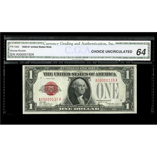 <B>Fr. 1500 $1 1928 Legal Tender Note. CGA Choice Uncirculated 64.</B></I><BR>This red seal carries the three digit serial of A00000130A. The margins are better than average with plenty of embossing.<BR><I>From the Scottsdale Collection</B></I>