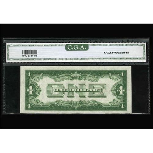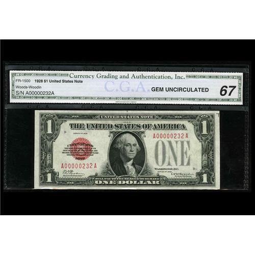 <B>Fr. 1500 $1 1928 Legal Tender Note. CGA Gem Uncirculated 67.</B></I><BR>It would be difficult to improve on the margins this note has as they are wide and very even for this earlier note. We see nothing in the holder to argue with the grade.<BR><I>From the Scottsdale Collection</B></I>