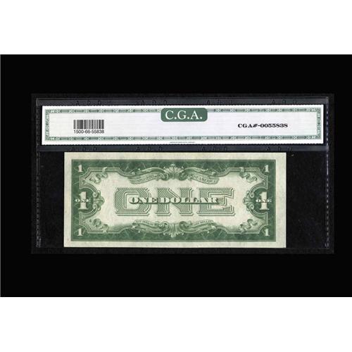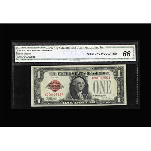 <B>Fr. 1500 $1 1928 Legal Tender Note. CGA Gem Uncirculated 66.</B></I><BR>Serial number A00000555A graces this note which saw limited use when it was delivered to Washington, DC. Fortunately these neat low numbers were saved en masse back in that day.<BR><I>From the Scottsdale Collection</B></I>