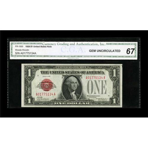 <B>Fr. 1500 $1 1928 Legal Tender Note. CGA Gem Uncirculated 67.</B></I><BR> Here is another pleasing example that offers nice margins and bright inks.<BR><BR><b>Shipping:</b> Coins & Currency (<a target="_blank" href="http://www.heritageauctions.com/common/shipping.php">view shipping information</a>)