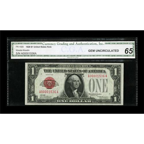 <B>Fr. 1500 $1 1928 Legal Tender Note. CGA Gem Uncirculated 65.</B></I><BR> A bright and well margined example of this popular Legal Tender type that exhibits fiery red inks and bold embossing.<BR><BR><b>Shipping:</b> Coins & Currency (<a target="_blank" href="http://www.heritageauctions.com/common/shipping.php">view shipping information</a>)