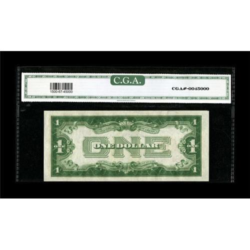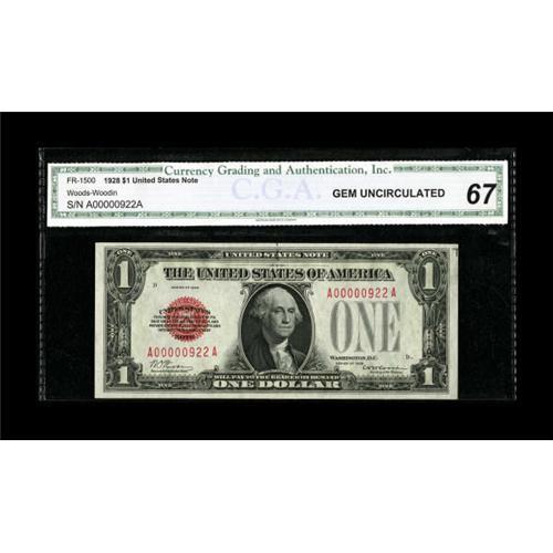 <B>Fr. 1500 $1 1928 Legal Tender Note. CGA Gem Uncirculated 67.</B></I><BR> This perfectly margined issue boasts an appealing low serial number A00000922A. The embossing is razor sharp, even in the tips of the Treasury Seal.<BR><BR><b>Shipping:</b> Coins & Currency (<a target="_blank" href="http://www.heritageauctions.com/common/shipping.php">view shipping information</a>)