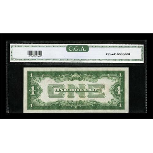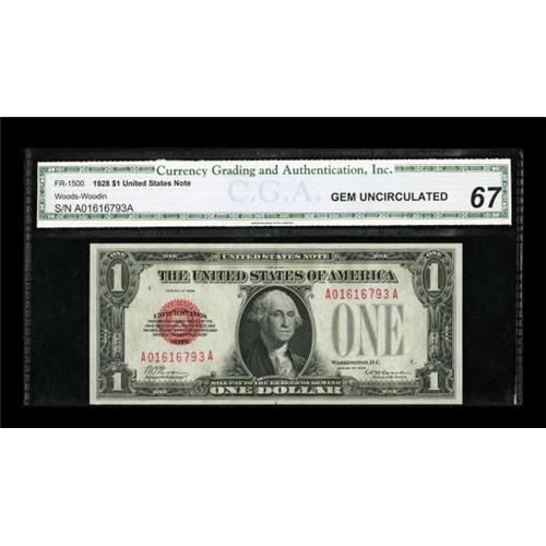 <B>Fr. 1500 $1 1928 Legal Tender Note. CGA Gem Uncirculated 67.</B></I><BR> This beautiful note exhibits even margins which is an elusive feature for this issue. <BR><BR><b>Shipping:</b> Coins & Currency (<a target="_blank" href="http://www.heritageauctions.com/common/shipping.php">view shipping information</a>)