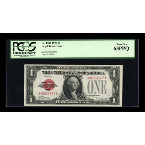<B>Fr. 1500 $1 1928 Legal Tender Note. PCGS Choice New 63PPQ.</B></I><BR> Low four digit serial number 4667 graces this ever popular small size issue.<BR><I>From The Drew Keough Collection</B></I><BR><BR><b>Shipping:</b> Coins & Currency (<a target="_blank" href="http://www.heritageauctions.com/common/shipping.php">view shipping information</a>)