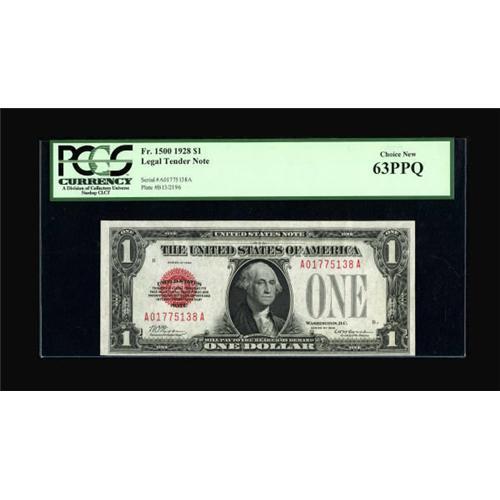 <B>Fr. 1500 $1 1928 Legal Tender Note. PCGS Choice New 63PPQ.</B></I><BR> A tight bottom margin which is so often the case keeps this bright note from a higher grade.<BR><BR><b>Shipping:</b> Coins & Currency (<a target="_blank" href="http://www.heritageauctions.com/common/shipping.php">view shipping information</a>)