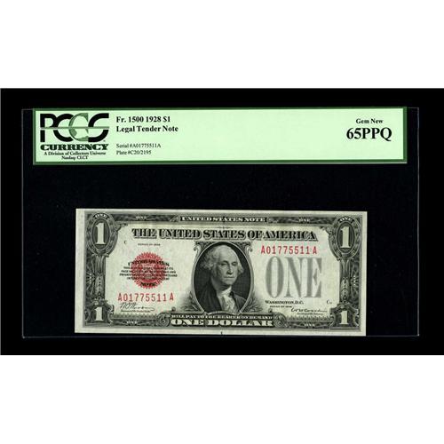 <B>Fr. 1500 $1 1928 Legal Tender Note. PCGS Gem New 65PPQ.</B></I><BR>Well centered and crackling fresh with deep and original embossing seen beneath the holder.<BR><I>From The Bill and Kathy Stella Currency Collection</B></I><BR><BR><b>Shipping:</b> Coin/Currency (<a target="_blank" href="http://www.heritageauctions.com/common/shipping.php">view shipping information</a>)