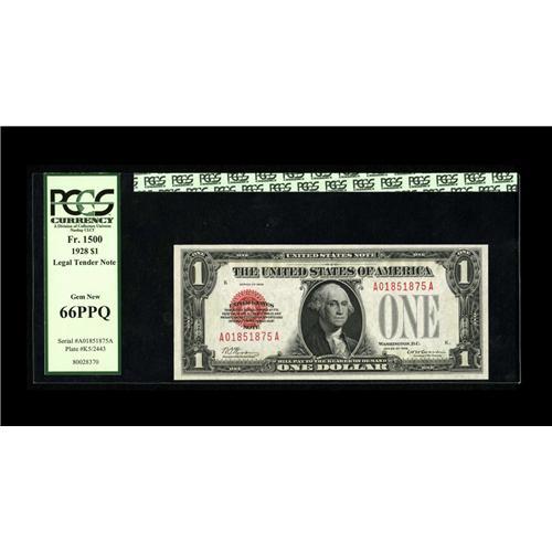 <B>Fr. 1500 $1 1928 Legal Tender Note. PCGS Gem New 66PPQ.</B></I><BR>This Ace displays vibrant red color and embossing that can be clearly seen even through the encapsulation surfaces.<BR><BR><b>Shipping:</b> Coin/Currency (<a target="_blank" href="http://www.heritageauctions.com/common/shipping.php">view shipping information</a>)