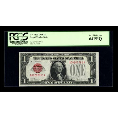 <B>Fr. 1500 $1 1928 Legal Tender Note. PCGS Very Choice New 64PPQ.</B></I><BR> Just a touch more top margin and this lovely note is surely a gem. Bright inks and plenty of embossing highlight this nicely centered example.<BR><BR><b>Shipping:</b> Coins & Currency (<a target="_blank" href="http://www.heritageauctions.com/common/shipping.php">view shipping information</a>)