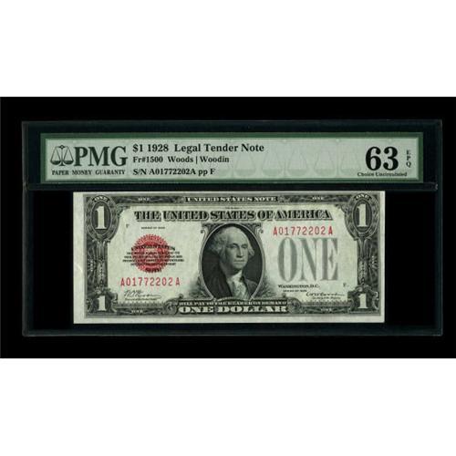 <B>Fr. 1500 $1 1928 Legal Tender Note. PMG Choice Uncirculated 63 EPQ.</B></I><BR> Bold embossing is noted through the third party holder.<BR><BR><b>Shipping:</b> Coins & Currency (<a target="_blank" href="http://www.heritageauctions.com/common/shipping.php">view shipping information</a>)