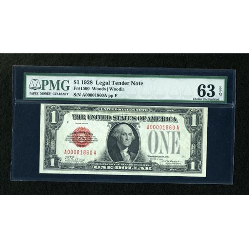 <B>Fr. 1500 $1 1928 Legal Tender Note. PMG Choice Uncirculated 63 EPQ.</B></I><BR> This is a wonderful example of a four digit serial number which came from the first 5000 for the issue released in Washington, DC.<BR><BR><b>Shipping:</b> Coins & Currency (<a target="_blank" href="http://www.heritageauctions.com/common/shipping.php">view shipping information</a>)