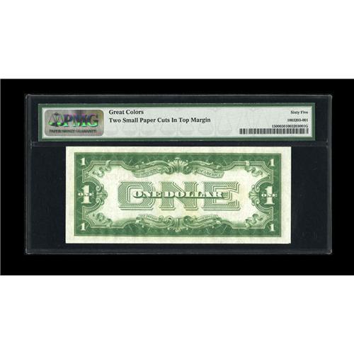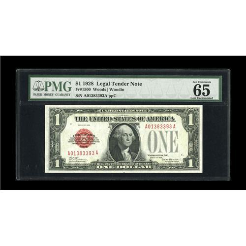 <B>Fr. 1500 $1 1928 Legal Tender Note. PMG Gem Uncirculated 65.</B></I><BR> Upon viewing the boardwalk margins on this gorgeous Gem, one wonders if two other notes from this sheet have any margins at all. Bold embossing is readily evident even through the third-party holder. The following two descriptors are also mentioned on the PMG holder, "Great Colors" and "Two Small Paper Cuts In Top Margin."