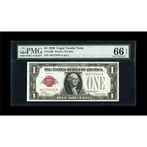 <B>Fr. 1500 $1 1928 Legal Tender Note. PMG Gem Uncirculated 66 EPQ.</B></I><BR> Solid margins are noted on this deeply embossed Legal. <BR><BR><b>Shipping:</b> Coins & Currency (<a target="_blank" href="http://www.heritageauctions.com/common/shipping.php">view shipping information</a>)