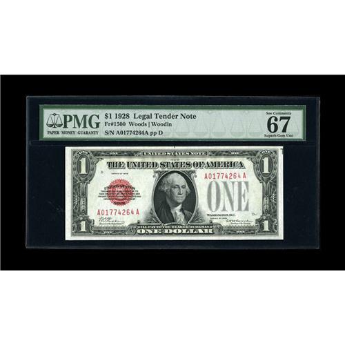 <B>Fr. 1500 $1 1928 Legal Tender Note. PMG Superb Gem Unc 67 EPQ.</B></I><BR>Wide margins on this well preserved beauty reveal the center of the sheet paper guide line marker on this D plate position note. We have not seen any third-party notes graded higher for this Friedberg number.<BR><BR><b>Shipping:</b> Coin/Currency (<a target="_blank" href="http://www.heritageauctions.com/common/shipping.php">view shipping information</a>)